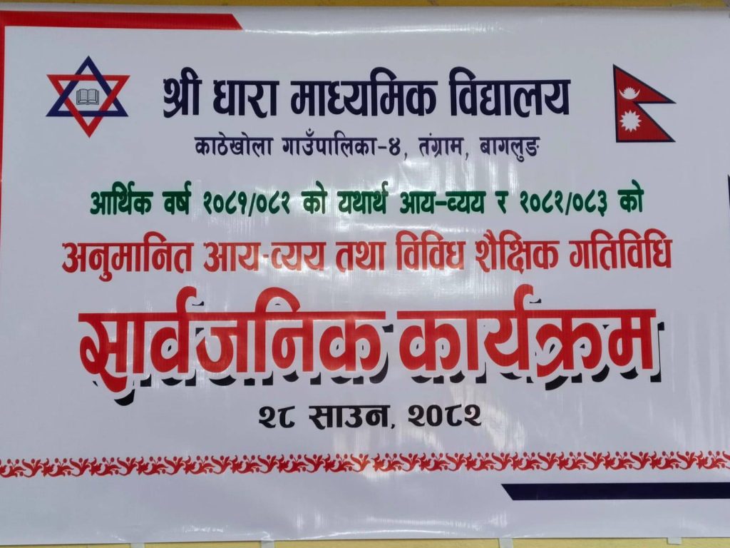 अाज मिति २०८२/०४/२८ गते धारा मा.वि काठेखोला गाउँपालिका-४ तंग्राम बाग्लुङको २०८१ श्रावण १ गतेदेखि २०८२ असार मसान्तसम्मको यथार्थ आय -व्यय
